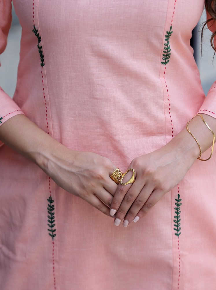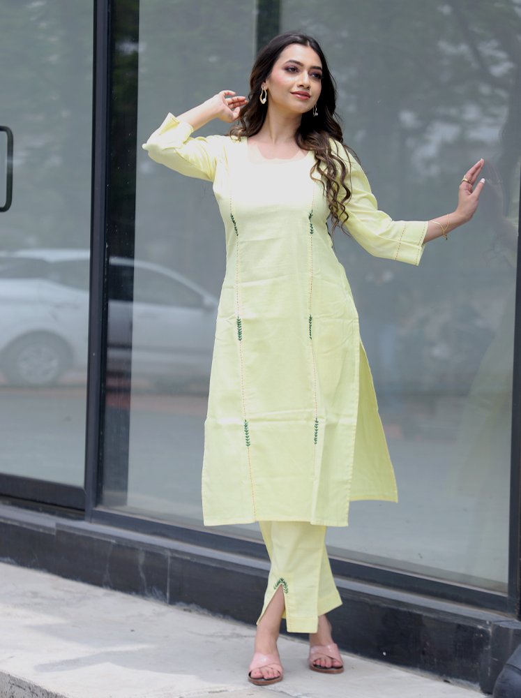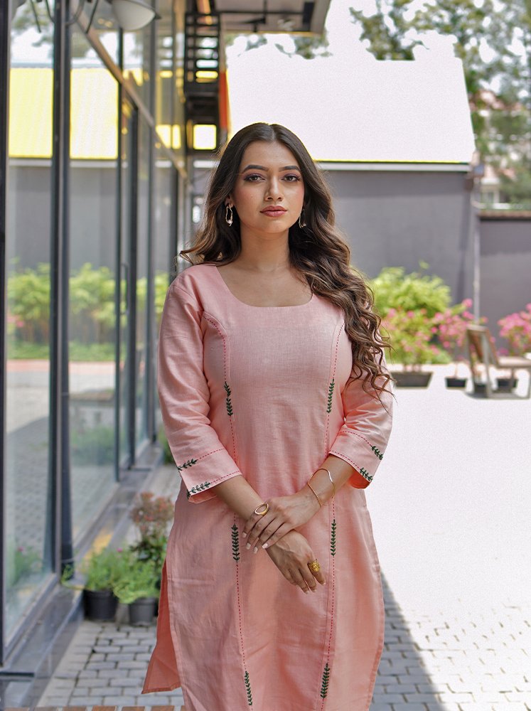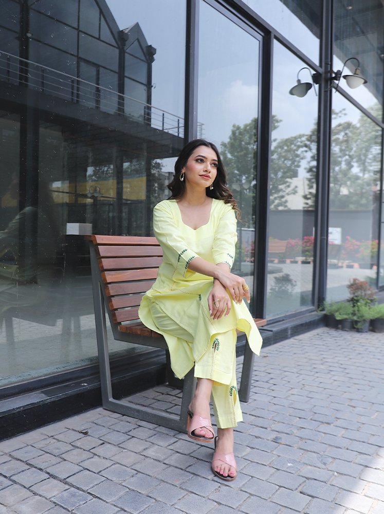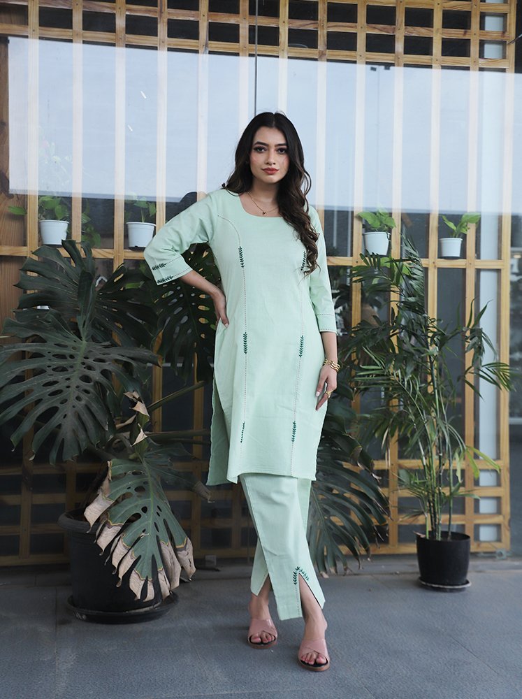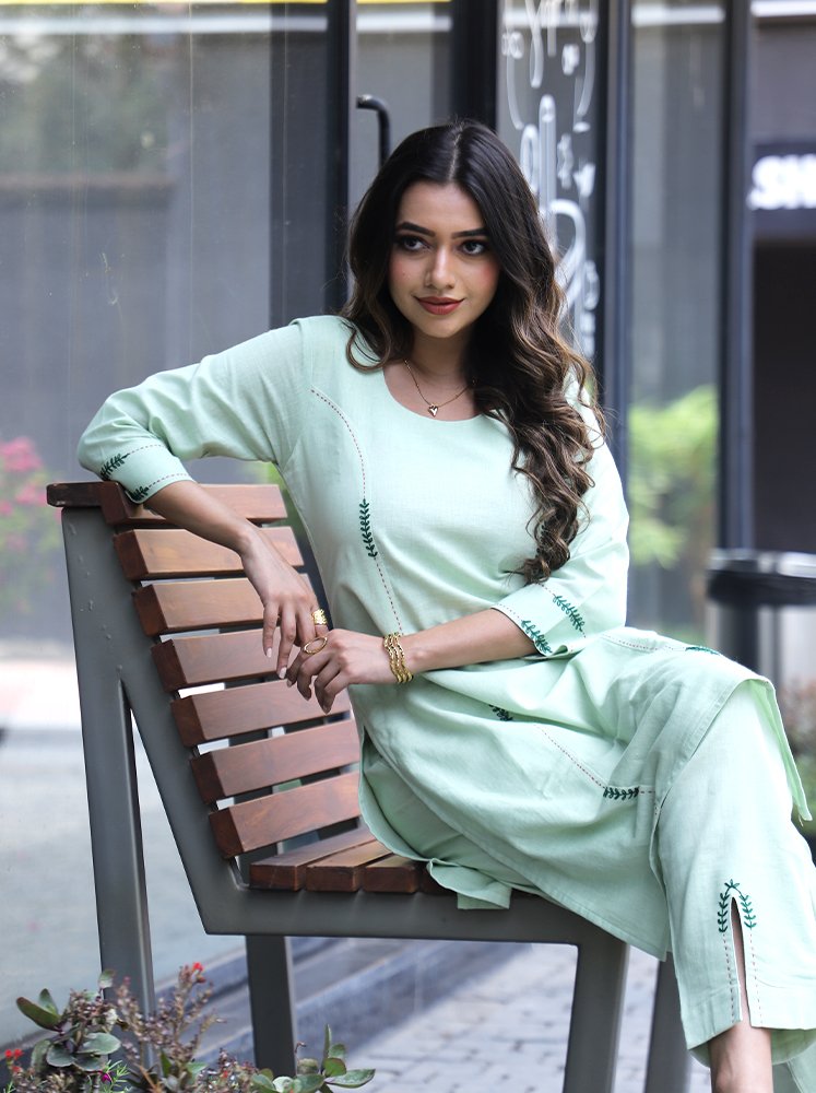 Work- Small leaf & Kantha stitch embroidery on kurta & bottom front cut.