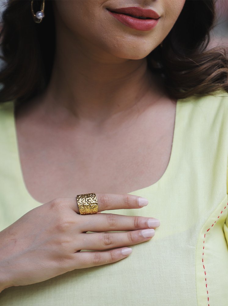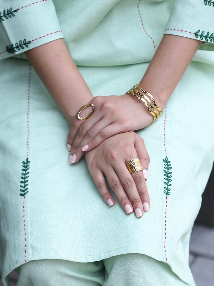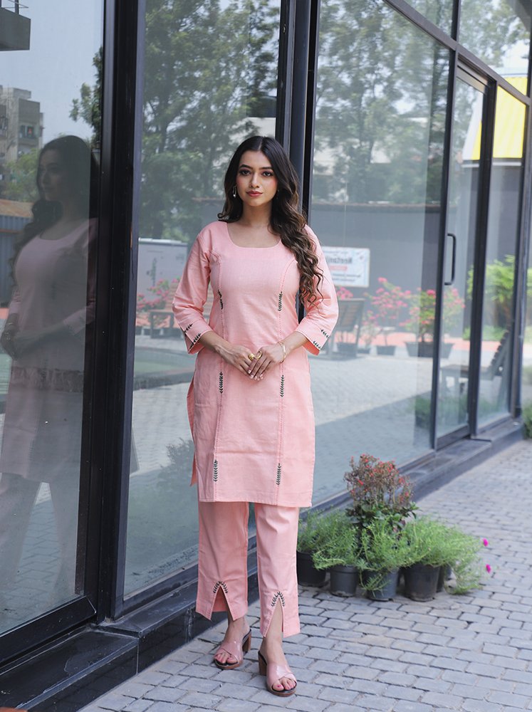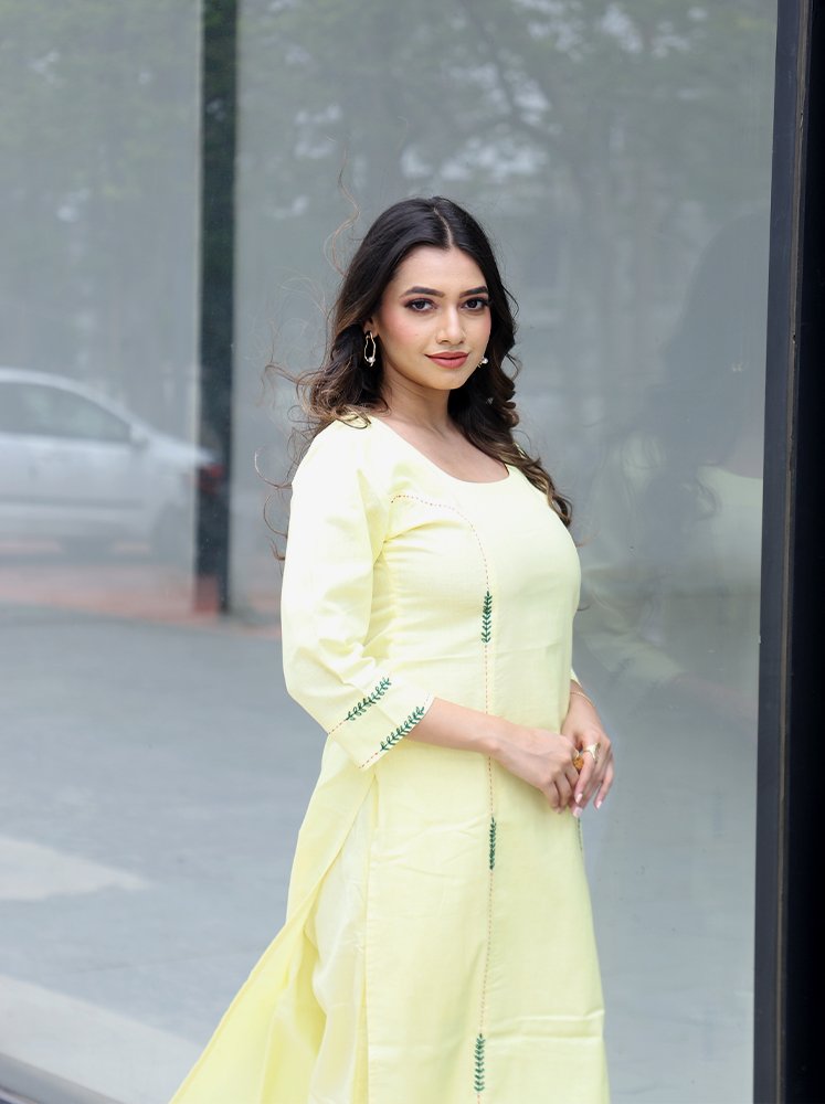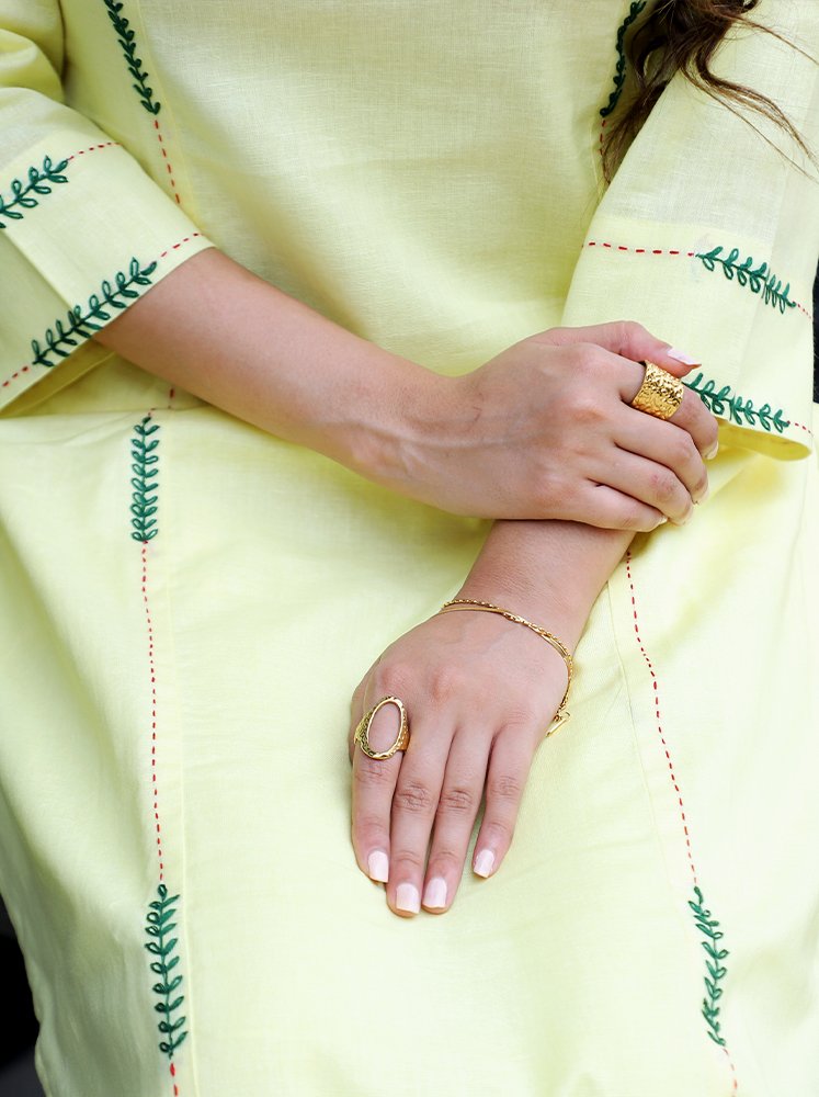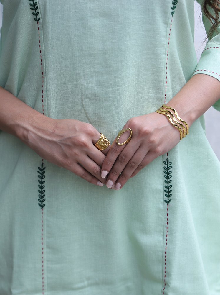 Work- Small leaf & Kantha stitch embroidery on kurta & bottom front cut.